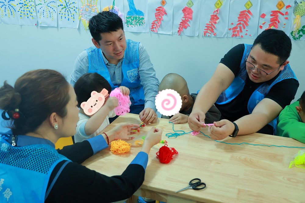 按照孩子们的年级,开展三堂各具特色的趣味手工体验课堂:小龄班的孩子们在志愿者手把手协助下,用彩色麻绳、钥匙弹簧扣制作萌趣小挂件;中龄班的孩子们借助气球、白醋、小苏打开展“生气的河豚”趣味科学实验,在观察气球膨胀的过程中感知科学魅力;大龄班的孩子们则利用各类彩色纽扣、贴纸,按颜色分类粘贴拼成大树、猫头鹰等创意图案。三个课堂各有侧重又相互呼应,志愿者们既是当天的小老师,更是温暖的陪伴者——他们为孩子擦拭沾到胶水的小手,耐心等待反应稍慢的孩子完成操作,用真诚的赞美回应每一个细微进步。看到这一幕幕,康复中心的老师表示:“这样的志愿活动既锻炼了孩子们的精细动作和认知能力,更让他们感受到了来自社会的关爱,这正是雷锋精神最生动的体现。”